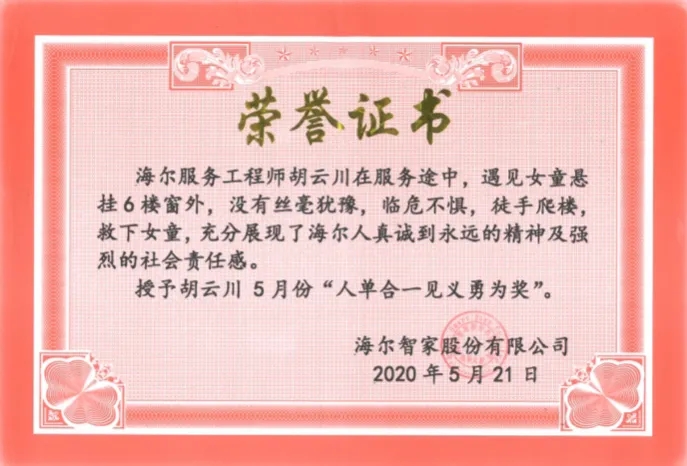 近日,四川省富順縣海爾成套服務(wù)工程師胡云川徒手爬樓,救下懸在六樓窗戶外的女童。