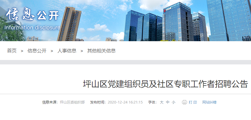 昨日,中共深圳市坪山區(qū)委組織部發(fā)布《坪山區(qū)黨建組織員及社區(qū)專職工作者招聘公告》,公告顯示坪山區(qū)面向社會(huì)及2020年應(yīng)屆畢業(yè)生公開招聘黨建組織員及社區(qū)專職工作者。