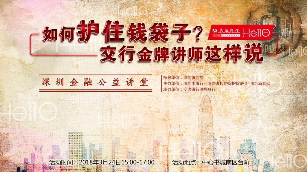 在深圳銀監(jiān)局指導(dǎo)下,由深圳新聞網(wǎng)和深圳市銀行業(yè)消費者權(quán)益保護促進會共同主辦,交通銀行深圳分行承辦的2018年“深圳金融公益講座”系列活動將在3月24日14:30,于中心書城南區(qū)大臺階拉開帷幕。
