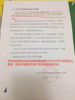 據(jù)悉,該市民在2017年已在信訪局上針對低層油煙管道對居民區(qū)排放油煙的問題進行投訴,當年12月1日得到了深圳市羅湖區(qū)環(huán)境保護與水務局的回復,稱羅湖區(qū)環(huán)水局已于2017年1月對相關低空排放油煙的餐廳提出了要將油煙高空排放的要求,餐廳安裝的高空煙管也已于2017年10月正式投入使用。