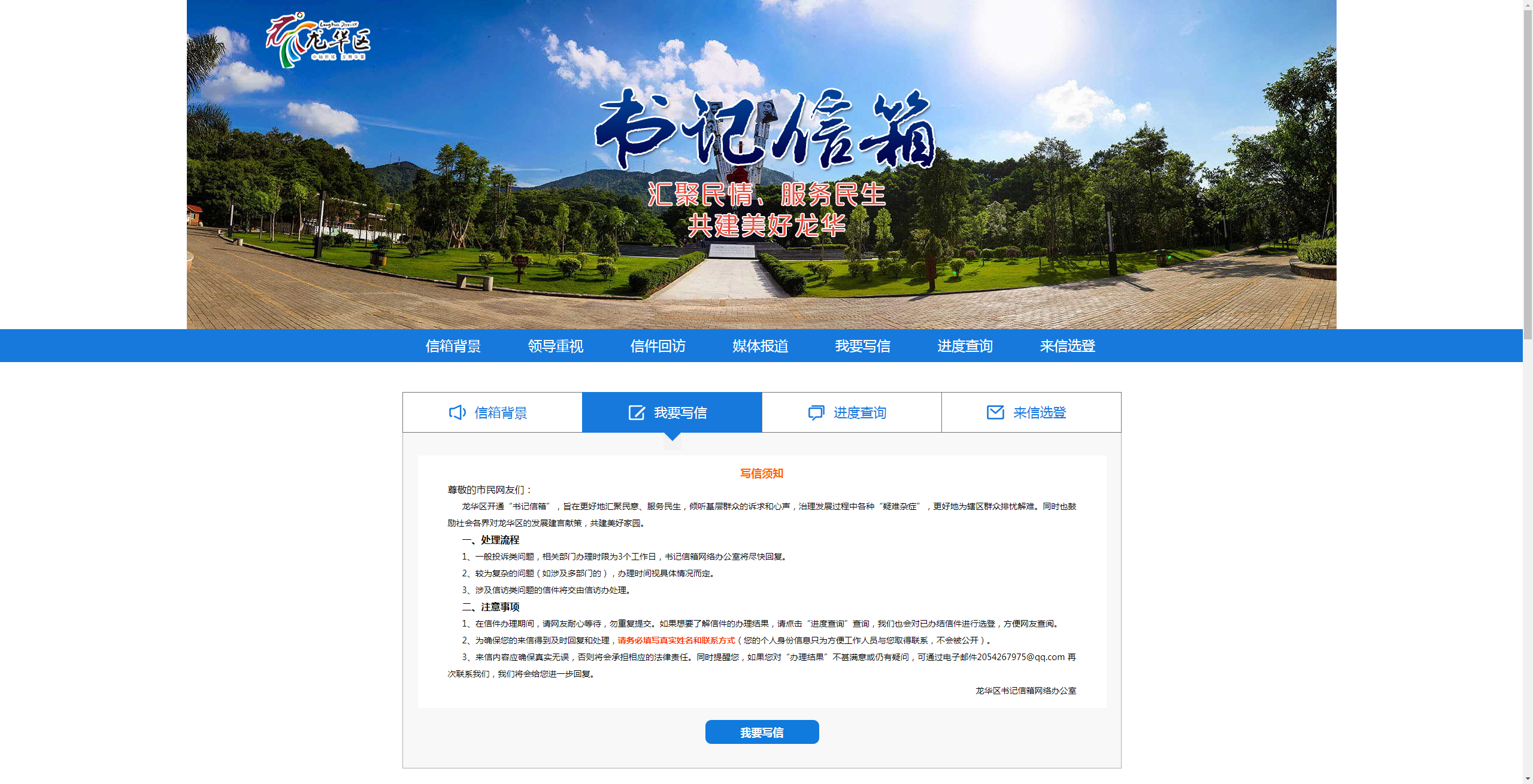 龍華區(qū)“書(shū)記信箱”網(wǎng)絡(luò)平臺(tái)是由龍華區(qū)領(lǐng)導(dǎo)的指導(dǎo)下搭建的網(wǎng)絡(luò)信息平臺(tái),由深圳新聞網(wǎng)團(tuán)隊(duì)進(jìn)行開(kāi)發(fā)搭建?!皶?shū)記信箱”的構(gòu)建,是龍華區(qū)委貫徹落實(shí)黨的群眾路線,踐行“三嚴(yán)三實(shí)”的一項(xiàng)新舉措?!皶?shū)記信箱”自2015年10月31日正式上線以來(lái),逐步成為龍華市民向龍華區(qū)委反映、提出建議、意見(jiàn)和投訴請(qǐng)求的重要渠道。