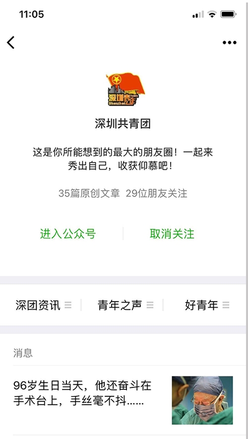 案例介紹:“深圳共青團”微信公眾號于2013年開通,是全省最早開通的政務微信號。在近兩年加大力度建設(shè)和推廣后,粉絲數(shù)有了飛躍性的增長,推送閱讀量和影響力也有了比較明顯的提升。截至目前,累計推送1700余篇,平均閱讀量1萬以上,單篇最高閱讀量達到36萬,粉絲數(shù)90余萬。目前,公眾號影響力在全國地市級團委中排名前3,在全市政務新媒體中排名前5。在發(fā)布的內(nèi)容上,主要關(guān)注時政要聞、社會熱點、政策解讀等與青年息息相關(guān)、喜聞樂見的話題內(nèi)容,弘揚愛國精神和時代精神,是深圳共青團聯(lián)系、引導和服務青年的重要載體。
