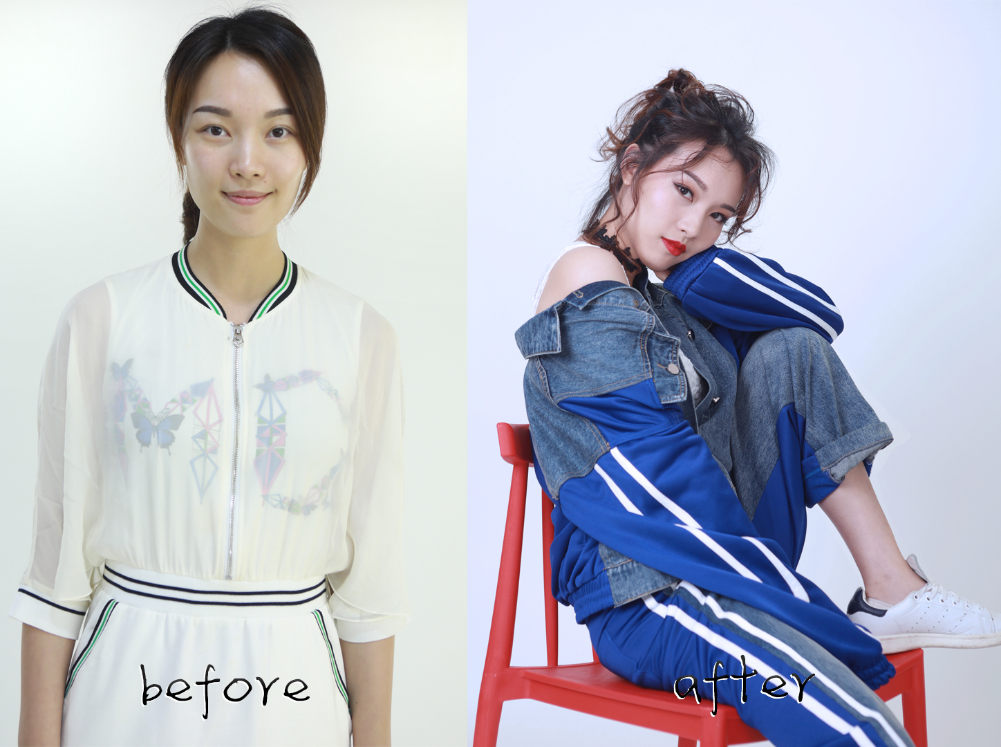 改造前后的芷苑小姐姐。從妝發(fā)上找到了五官和臉型的個(gè)性,服裝上選擇了牛仔最擅長(zhǎng)的街頭風(fēng)格。從一個(gè)清新的辦公室女孩,變成了時(shí)髦街頭酷女孩。