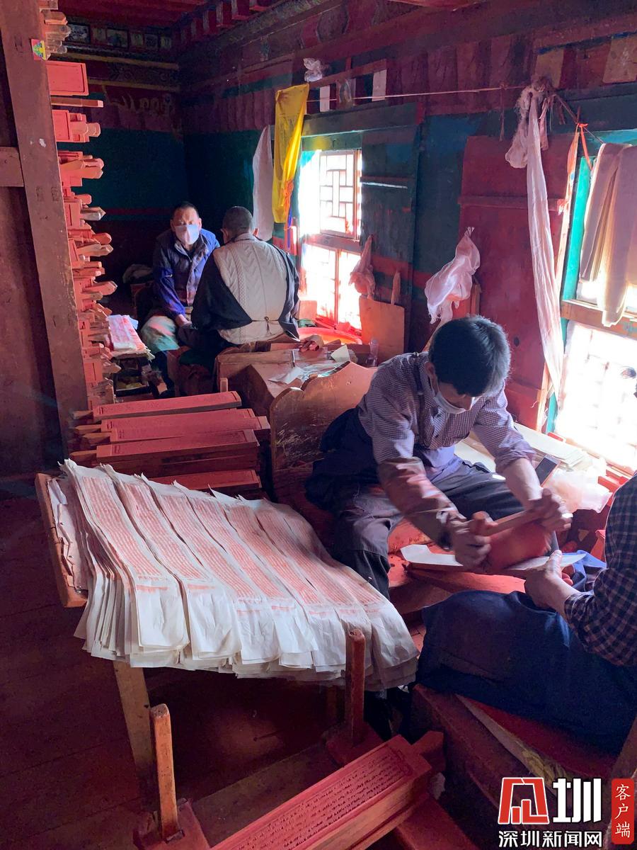 德格印經(jīng)院的印刷工藝大體可分裁紙、顏料加工、印刷、裝訂四個流程。又可細分裁紙、泡紙、兌墨、研磨、兌制朱砂、取版、印刷、晾曬、洗版、歸庫、分頁、核對、裝訂、打磨、刷色邊、包裝等十余道工序。李仁奇攝