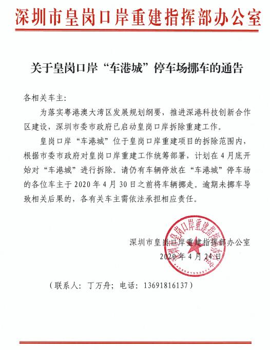 據(jù)了解,皇崗口岸“車(chē)港城”位于皇崗口岸重建項(xiàng)目的拆除范圍內(nèi),根據(jù)市委市政府對(duì)皇崗口岸重建工作統(tǒng)籌部署,計(jì)劃在4月底開(kāi)始對(duì)“車(chē)港城”進(jìn)行拆除。請(qǐng)仍有車(chē)輛停放在“車(chē)港城”停車(chē)場(chǎng)的各位車(chē)主于2020年4月30日之前將車(chē)輛挪走,逾期未挪車(chē)導(dǎo)致相關(guān)后果的,各有關(guān)車(chē)主需依法承擔(dān)相應(yīng)責(zé)任。