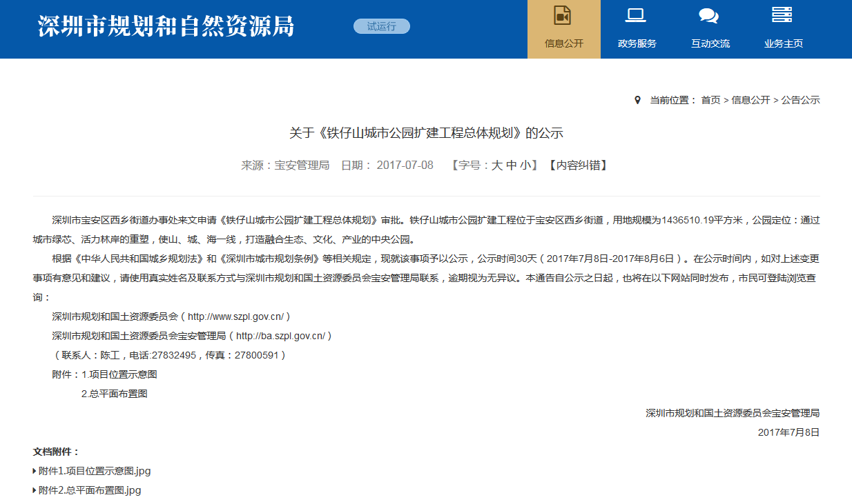 早在2017年,當(dāng)時的市規(guī)土委曾經(jīng)在官方網(wǎng)站發(fā)布了《關(guān)于<鐵仔山城市公園擴建工程總體規(guī)劃>的公示》:深圳市寶安區(qū)西鄉(xiāng)街道辦事處來文申請《鐵仔山城市公園擴建工程總體規(guī)劃》審批。鐵仔山城市公園擴建工程位于寶安區(qū)西鄉(xiāng)街道,用地規(guī)模為1436510.19平方米,公園定位:通過城市綠芯、活力林岸的重塑,使山、城、海一線,打造融合生態(tài)、文化、產(chǎn)業(yè)的中央公園。