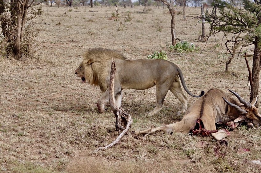 作者運(yùn)氣不錯,在塞倫蓋蒂巡游時巧遇一頭雄獅守護(hù)在一頭被咬死的大羚羊旁。李仁奇 攝