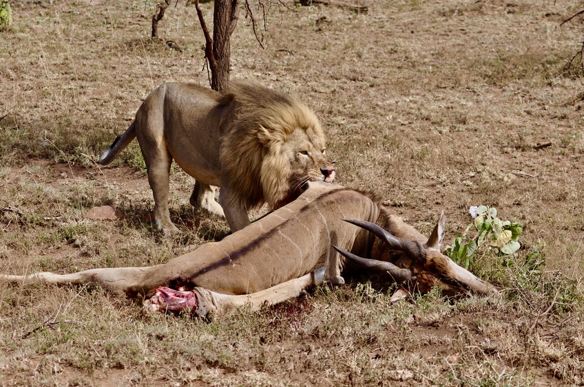 這頭估計重達(dá)二、三百斤的大羚羊是早晨被三頭雌獅捕獲的,雄獅趕到后,雌獅們各自撕扯一塊肉到遠(yuǎn)處享用去了。雄獅腹中饑餓,不顧乘坐兩臺越野車的十位游客近在咫尺,只管用力撕咬拖拽羚羊尸體。李仁奇 攝