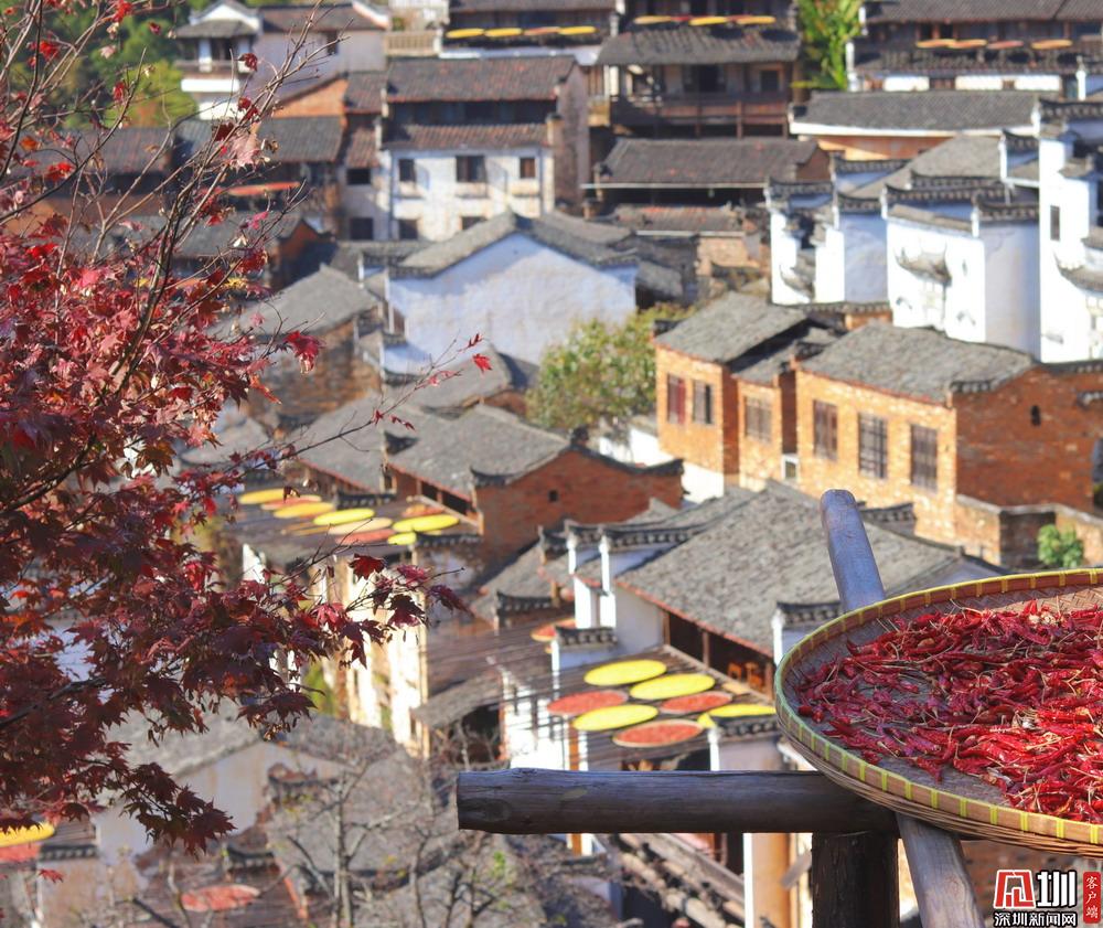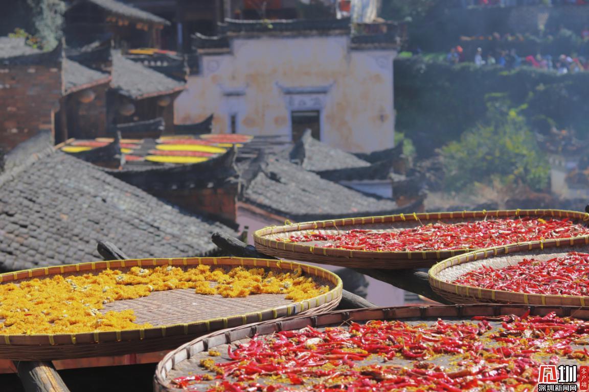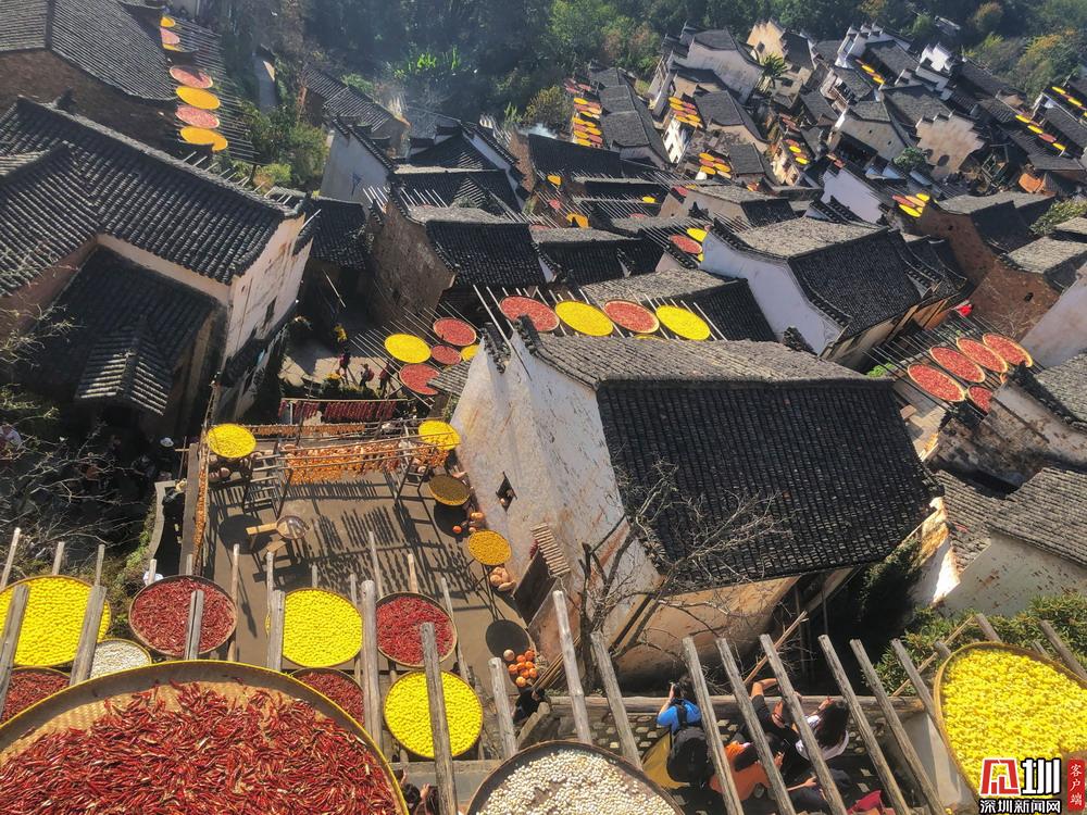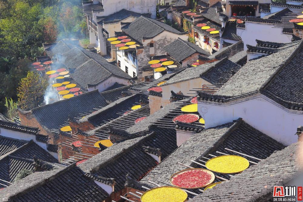 見圳客戶端·深圳新聞網(wǎng)2020年11月25日訊 江西婺源縣篁嶺村獨特的“曬秋”農(nóng)俗景觀。篁嶺村位于江西省上饒市婺源縣東北部,是著名的“曬秋”文化起源地,也是一座距今近六百年歷史的徽州古村。每當日出山頭,數(shù)百棟徽派古民居在百米落差的坡面錯落排布,整個山間村落徽式民居土磚外墻與曬架上五彩繽紛豐收成果組合,繪就出“曬秋”農(nóng)俗特色景觀。