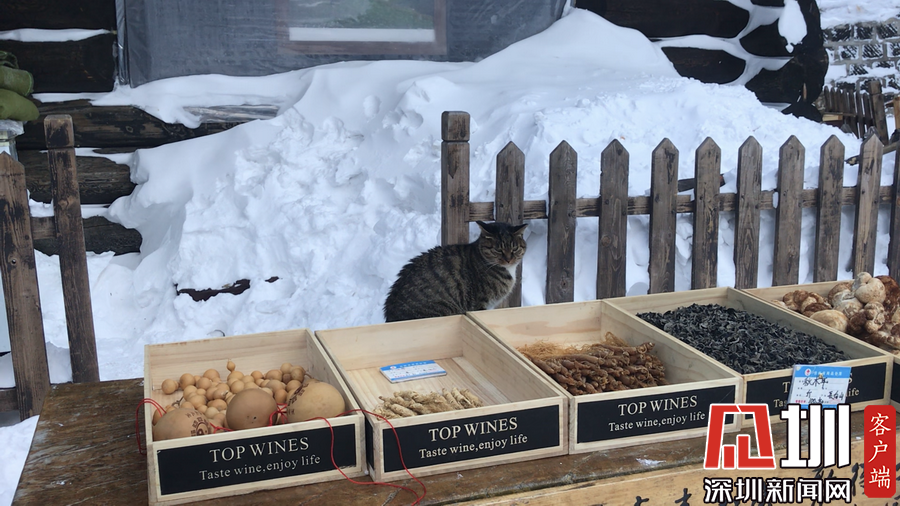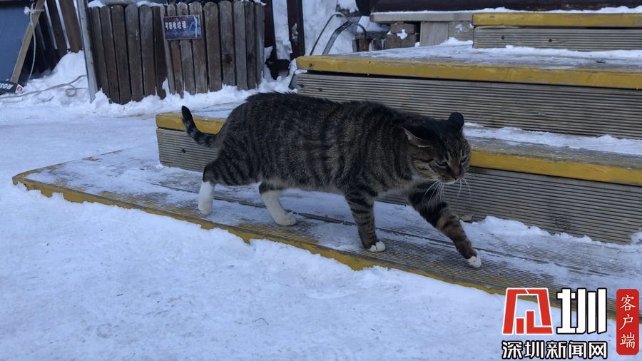 游客休息站的貓咪也被凍得不敢在雪地上走。