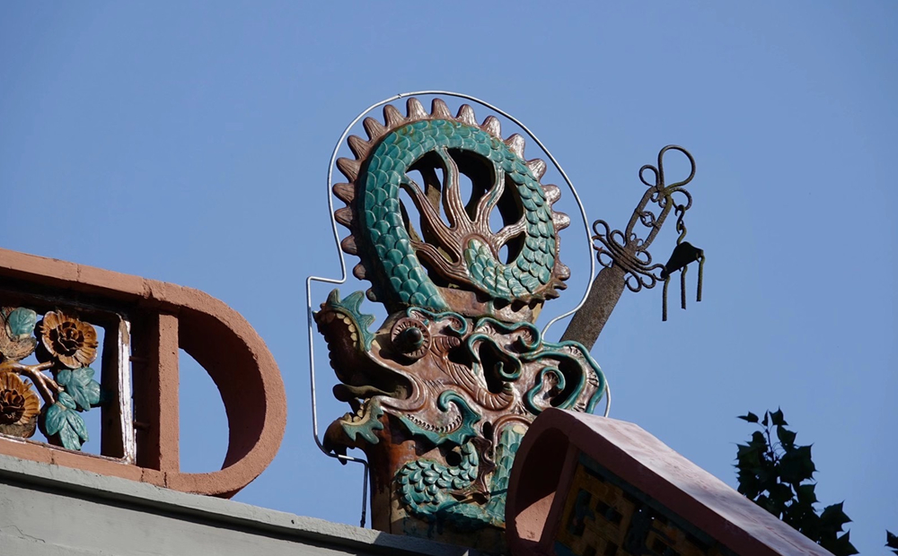 赫曦臺,在臺的左右內壁上有丈余高的"福"、"壽"二字,臺的頂部雕飾有八卦圖、蝙蝠、壽字圖案。李仁奇 攝