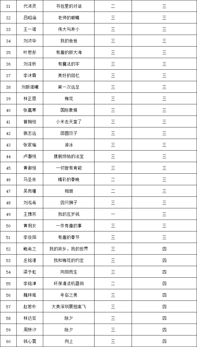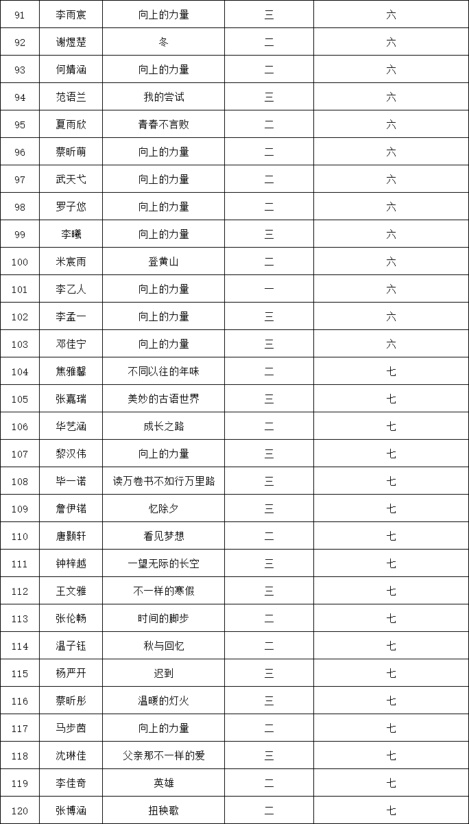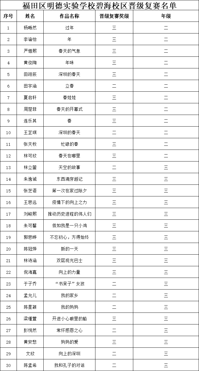 自2021年1月,活動(dòng)征稿啟動(dòng)以來(lái),獲得了深圳市廣大中小學(xué)生、教師、文學(xué)愛(ài)好者的熱烈響應(yīng)積極參與,吸引了深圳百余所學(xué)校的上萬(wàn)人關(guān)注報(bào)名?,F(xiàn)公布福田區(qū)明德實(shí)驗(yàn)學(xué)校碧海校區(qū)專場(chǎng)晉級(jí)復(fù)賽名單如下:
