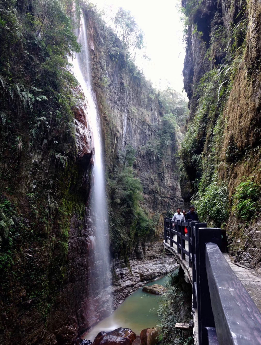 五彩黃龍瀑布,高60余米,順一似教堂大鐘狀的紫銅色鈣華體飛流直下,故稱為金鐘瀑布。李仁奇 攝