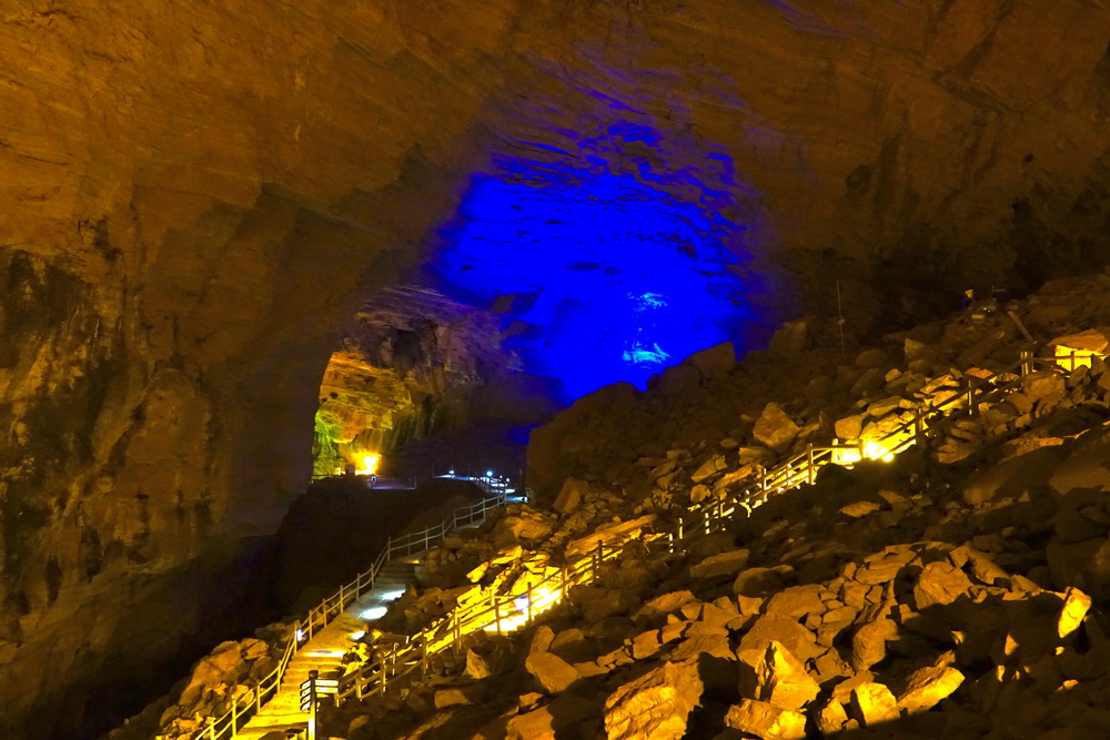 旱洞里現(xiàn)在有兩個(gè)劇場(chǎng),有定時(shí)的激光和歌舞表演。水洞里有地下瀑布10余處。李仁奇 攝