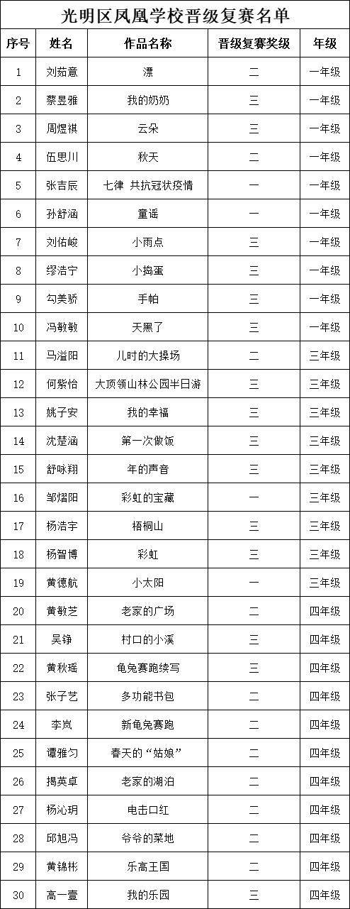 自2021年1月,活動征稿啟動以來,獲得了深圳市廣大中小學生、教師、文學愛好者的熱烈響應積極參與,吸引了深圳百余所學校的上萬人關注報名。現(xiàn)公布深圳市光明區(qū)鳳凰學校專場晉級復賽名單如下: