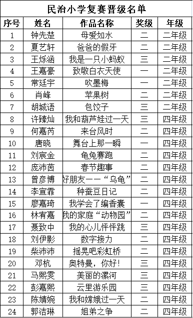 自2021年1月,活動(dòng)征稿啟動(dòng)以來(lái),獲得了深圳市廣大中小學(xué)生、教師、文學(xué)愛(ài)好者的熱烈響應(yīng)積極參與,吸引了深圳百余所學(xué)校的上萬(wàn)人關(guān)注報(bào)名?,F(xiàn)公布龍華區(qū)民治小學(xué)晉級(jí)復(fù)賽名單如下: