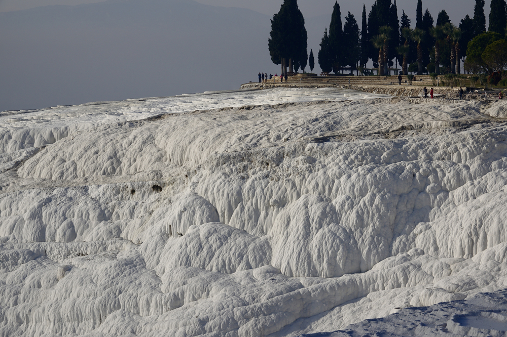 終年維持?jǐn)z氏29度的溫泉水在山崖上經(jīng)過億萬(wàn)年流動(dòng),其中的礦物質(zhì)沉淀下來,把整個(gè)山坡染成白色的露天溶巖,遠(yuǎn)看形似堆積如山的棉花,一腳踩上去,才知道是堅(jiān)硬的白色石灰?guī)r。由于一層又一層的巖石形狀很像城堡,故得名棉花堡。李仁奇 攝