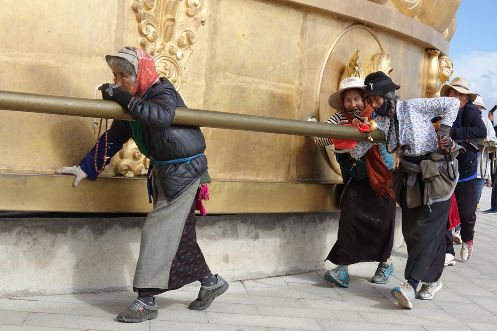 據(jù)傳,轉(zhuǎn)動經(jīng)輪一周,即等同于念誦《大藏經(jīng)》一遍。藏傳佛教認為,“持頌真言越多,越表明對佛的虔誠,可得脫輪回之苦”。李仁奇 攝