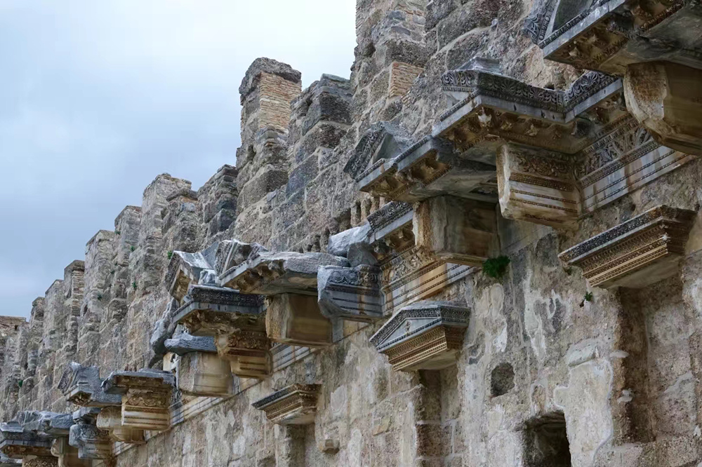 舞臺的墻壁上裝飾著古希臘式樣的圓柱,細(xì)節(jié)精美,雕工考究。據(jù)考證,舞臺上方還曾經(jīng)覆蓋著屋頂,可惜已經(jīng)損毀。李仁奇 攝