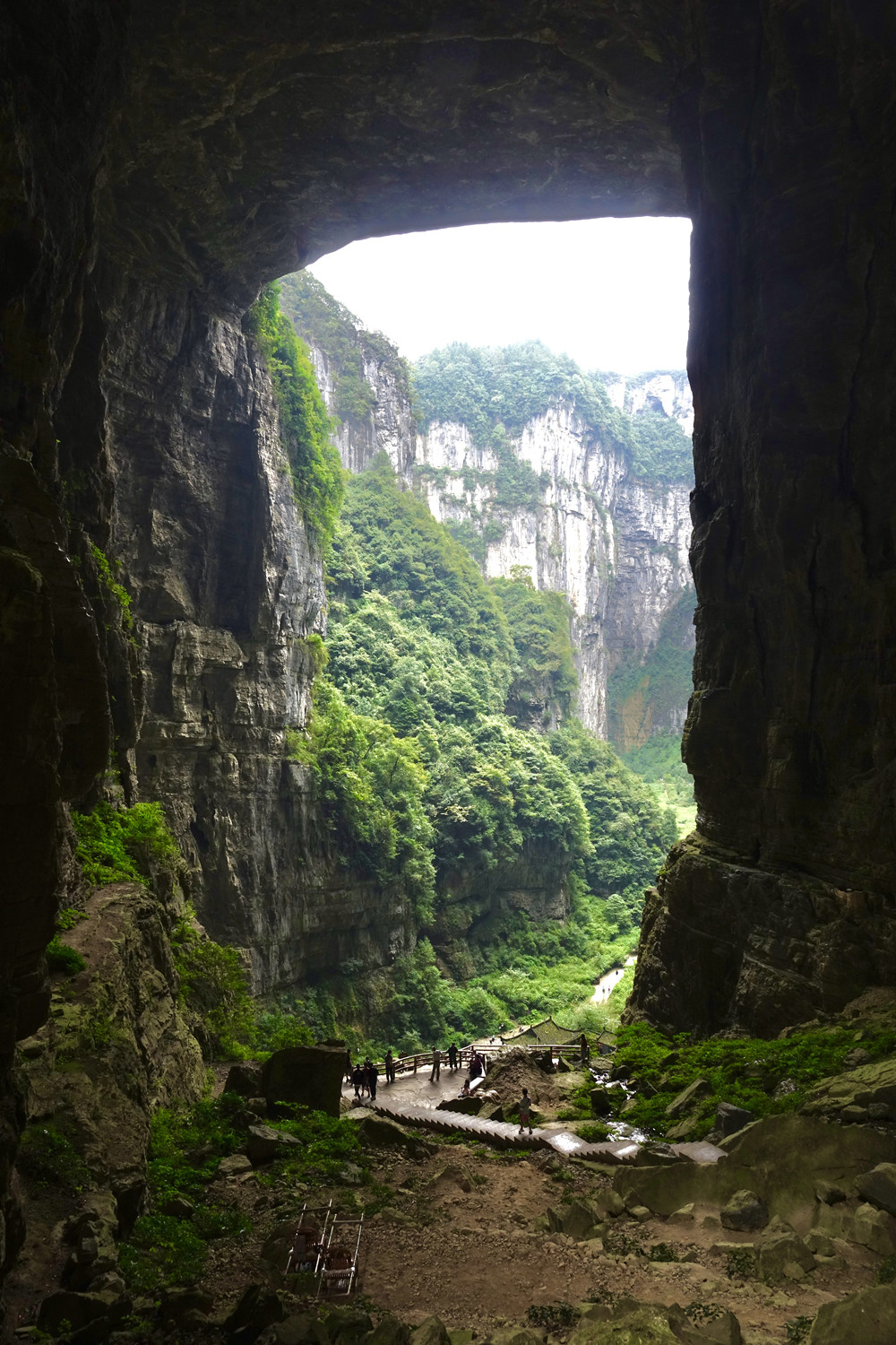 天龍橋?yàn)檠蛩訊{谷上的第一座天生橋,又名頭道橋,高大厚重、磅礴氣勢(shì),以雄壯稱(chēng)奇。橋高235m,橋厚150m,平均拱橋高度96m。拱孔跨度20-75m,平均34m,橋面寬度147m。李仁奇 攝