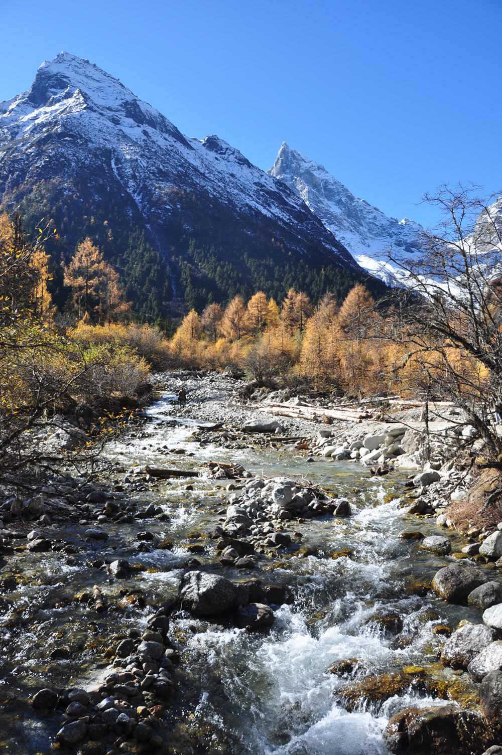 從雪山上流淌下來的小溪,在雪山和藍(lán)天的映襯下,分外漂亮。李仁奇 攝
