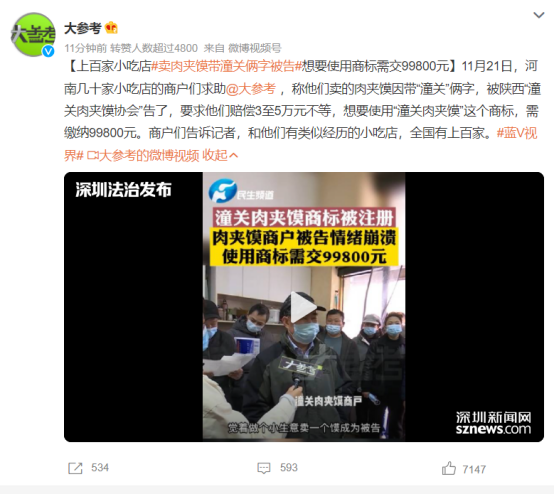 6.【法治事件】全國(guó)多個(gè)經(jīng)營(yíng)肉夾饃的店家“潼關(guān)肉夾饃”這幾個(gè)字不能用了,不但要賠償給潼關(guān)肉夾饃協(xié)會(huì)3萬(wàn)到5萬(wàn)元不等的賠償金,要繼續(xù)用這個(gè)商標(biāo),還得向協(xié)會(huì)交99800元。11月26日,國(guó)家知識(shí)產(chǎn)權(quán)局針對(duì)“逍遙鎮(zhèn)胡辣湯”和“潼關(guān)肉夾饃”的商標(biāo)糾紛事件做了回應(yīng)。當(dāng)天,潼關(guān)肉夾饃協(xié)會(huì)就“潼關(guān)肉夾饃”商標(biāo)進(jìn)行維權(quán)一事向全國(guó)潼關(guān)肉夾饃經(jīng)營(yíng)者道歉。