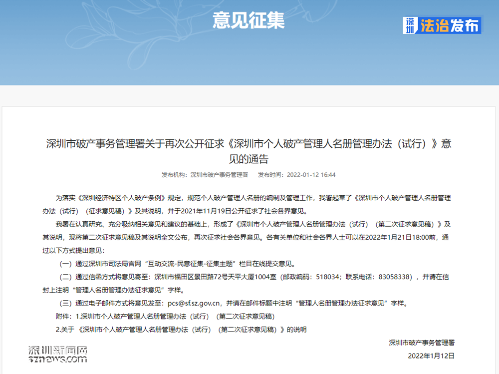 讀特客戶端?深圳新聞網(wǎng)2022年1月18日訊(記者 張玲)日前,深圳市破產(chǎn)事務(wù)管理署在深圳市司法局發(fā)布通告,面向社會(huì)征集《深圳市個(gè)人破產(chǎn)管理人名冊管理辦法(試行)》(以下簡稱管理辦法)的意見,有意提交者可在2022年1月21日18時(shí)前提交。