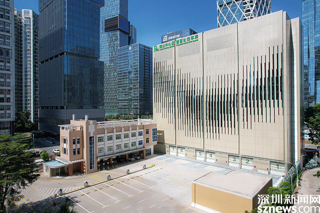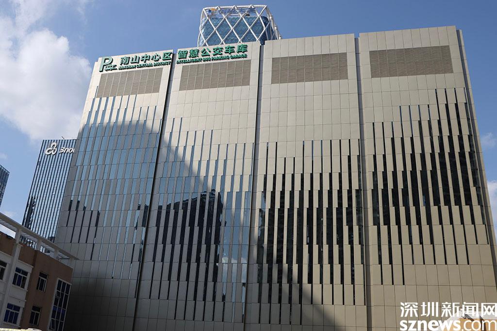 深圳南山中心區(qū)智慧立體公交車庫外觀。