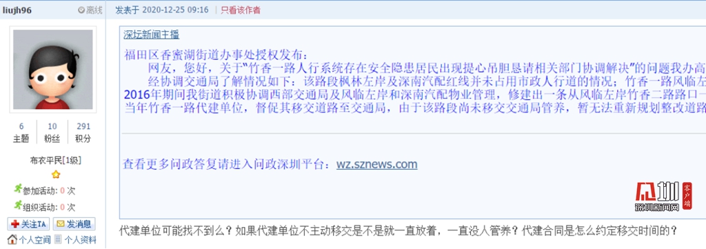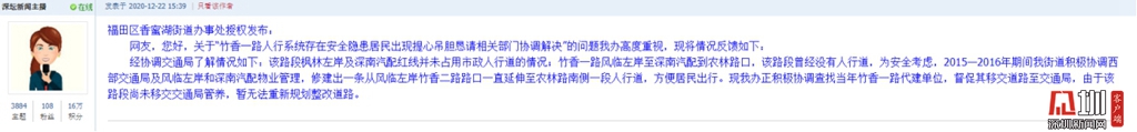 2020年12月22日,福田區(qū)香蜜湖街道辦事處在論壇回貼。