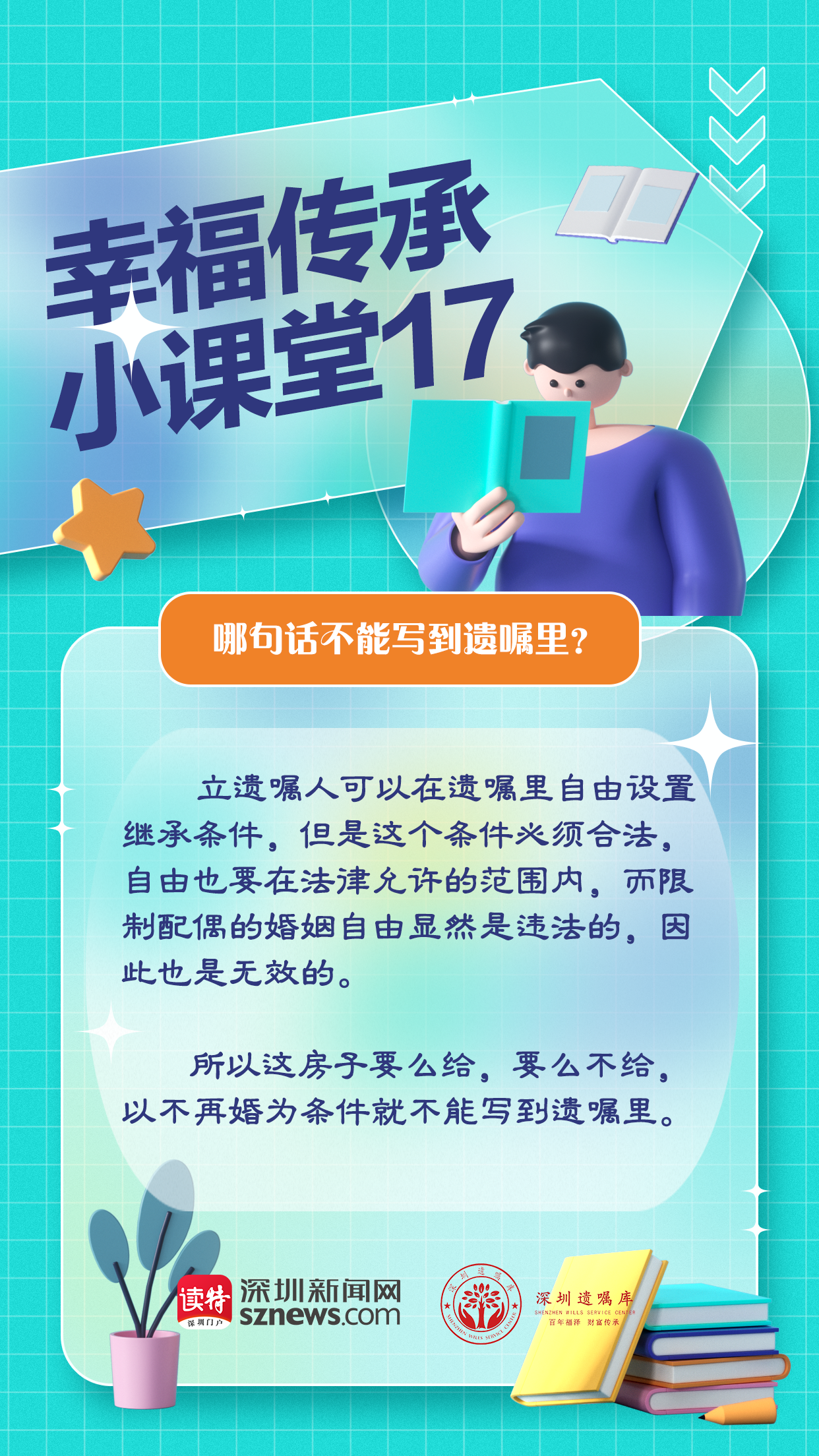 由深圳新聞網(wǎng)聯(lián)合廣東嘉得信律師事務(wù)所、深圳遺囑庫(kù)特別策劃的“幸福傳承小課堂”第17期就來說說,哪些話不能寫到遺囑里。上述案例的老兩口考慮很周全,他們把各個(gè)銀行的存款都列了一個(gè)明細(xì)單,標(biāo)明了分配方式,哪一筆給兒子,哪一筆留給女兒,總體來說兒女分到的財(cái)產(chǎn)都差不多。