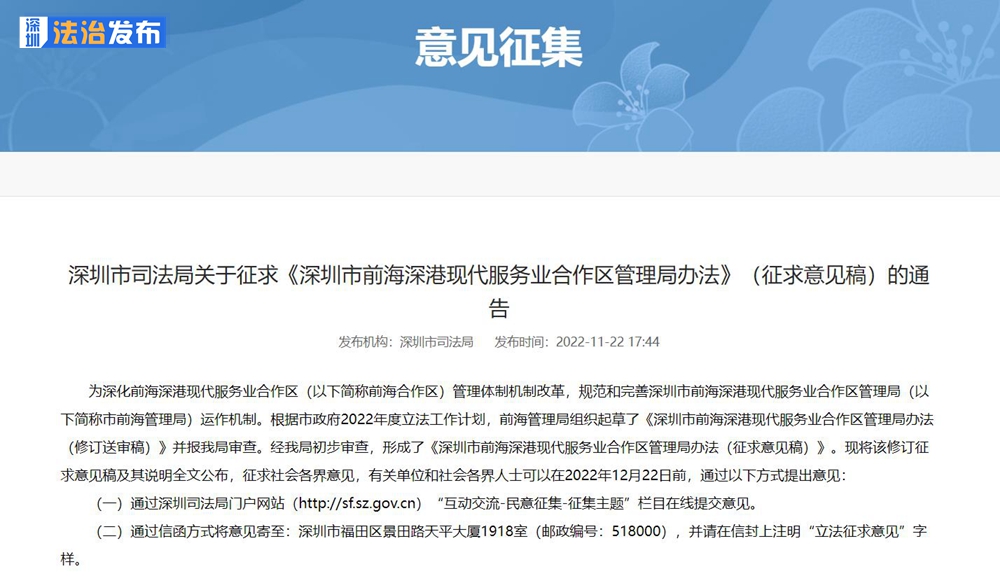 讀特客戶端·深圳新聞網(wǎng)2022年11月24日訊(記者 翁任瑩)近日,深圳市司法局發(fā)布《深圳市前海深港現(xiàn)代服務(wù)業(yè)合作區(qū)管理局辦法(征求意見稿)》(以下簡(jiǎn)稱《辦法》)及說明全文,并向社會(huì)各界征求意見。