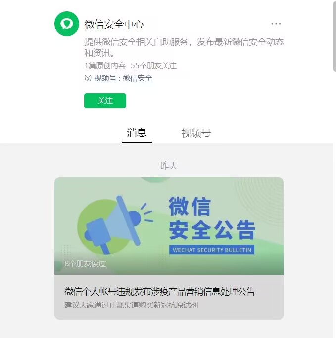 微信安全中心公眾號(hào)頁(yè)面截圖。