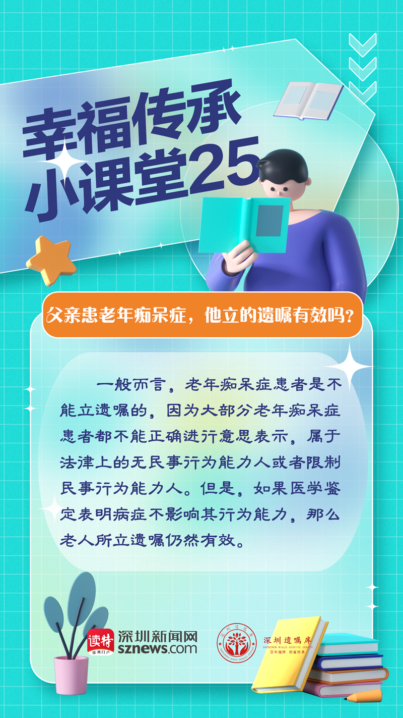 讀特客戶端·深圳新聞網(wǎng)2023年2月8日訊(記者 翁任瑩 張玲)李女士照顧患了老年癡呆癥的父親六年,父親去世后,李女士三個哥哥要求與妹妹平分父親的遺產(chǎn)。女兒拿出了一份父親的遺囑,哥哥們卻認(rèn)為這份遺囑無效。由廣東嘉得信律師事務(wù)所和深圳新聞網(wǎng)聯(lián)合開設(shè)的“幸福傳承小課堂”開講第25期,我們來聊聊上述情形的遺囑效力。