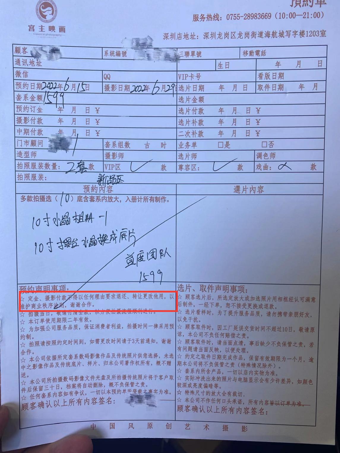 深圳市消委會接到消費者投訴后,立即聯(lián)系消費者及商家核實情況。商家表示協(xié)議已標明不可退還或更改他用,只同意消費者把拍攝服務自行轉(zhuǎn)讓出去。市消委會告知商家合同中的“不退不換”是典型的“霸王條款”,屬于無效格式條款,若消費者違約可以收取一定比例的違約金。后商家同意扣除30%違約金,退款1120元,但一直拖延,至今仍未退費。經(jīng)查,商家注冊地址:深圳市龍崗區(qū)龍崗街道南聯(lián)社區(qū)龍崗大道(龍崗段)6001號海航國興花園南苑6AB棟B1207。