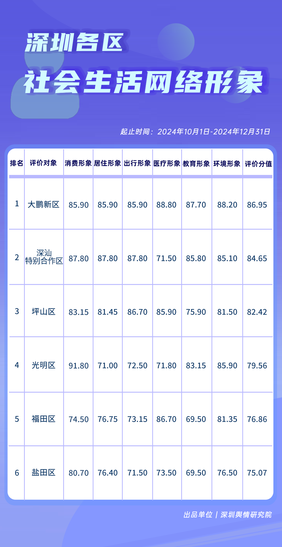 10-12月,《深圳各區(qū)社會(huì)生活網(wǎng)絡(luò)形象榜》中,大鵬新區(qū)、深汕特別合作區(qū)、坪山區(qū)綜合評(píng)價(jià)分值在80分以上,表現(xiàn)優(yōu)異。光明區(qū)、福田區(qū)、鹽田區(qū)各有所長,分別占據(jù)了榜單第四至第六的位置,成為深圳各區(qū)致力于改善社會(huì)民生、促進(jìn)區(qū)域協(xié)調(diào)發(fā)展的生動(dòng)范例。