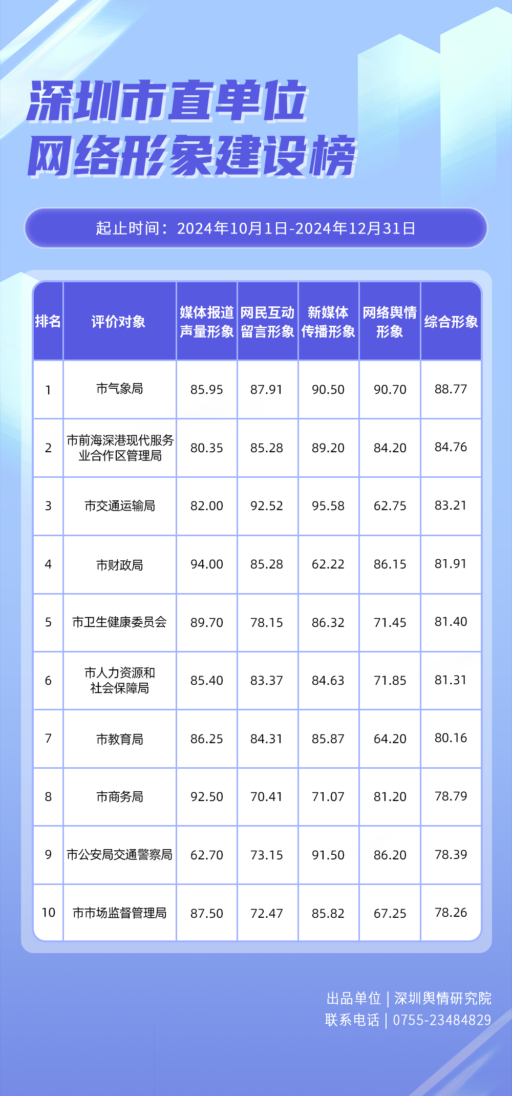 10-12月,市氣象局、市前海深港現(xiàn)代服務(wù)業(yè)合作區(qū)管理局、市交通運(yùn)輸局、市財(cái)政局、市衛(wèi)生健康委員會(huì)、市人力資源和社會(huì)保障局、市教育局、市商務(wù)局、市公安局交通警察局、市市場監(jiān)督管理局在網(wǎng)絡(luò)形象建設(shè)工作方面表現(xiàn)相對(duì)突出,登上《深圳市直單位網(wǎng)絡(luò)形象建設(shè)榜》。其中,市氣象局、市前海深港現(xiàn)代服務(wù)業(yè)合作區(qū)管理局、市交通運(yùn)輸局憑借其卓越的網(wǎng)絡(luò)形象建設(shè)工作,成功躋身前列,體現(xiàn)出高水平的網(wǎng)絡(luò)形象管理能力,展現(xiàn)了市直單位在新媒體時(shí)代下的責(zé)任與擔(dān)當(dāng),為構(gòu)建和諧社會(huì)環(huán)境貢獻(xiàn)了積極力量。