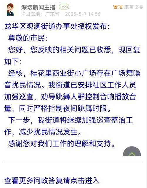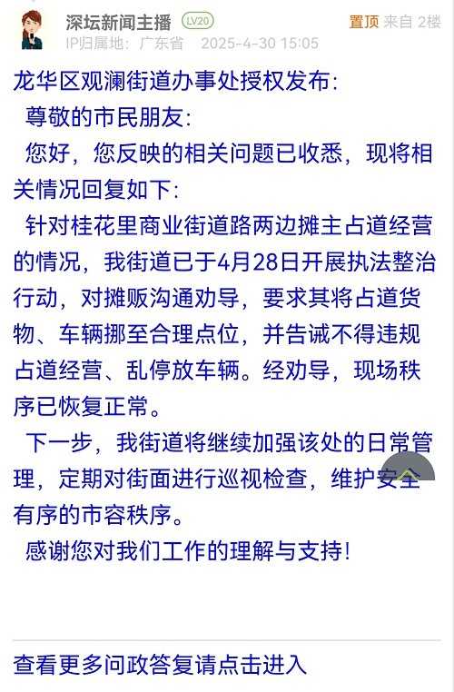 據(jù)統(tǒng)計,2025年4月28日-2025年5月4日,網(wǎng)友在深圳論壇發(fā)布問政類帖文共31篇,得到相關(guān)單位正式回應(yīng)的帖文數(shù)為27篇,本期簡報回應(yīng)速度最快的單位:龍華區(qū)觀瀾街道辦事處。