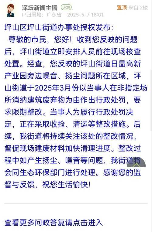 尊敬的市民,您好!收到您反映的問題后,坪山街道立即安排人員前往現(xiàn)場核查處置。經(jīng)查,您反映的坪山街道日晶高新產(chǎn)業(yè)園旁邊噪音、揚(yáng)塵問題所在區(qū)域,坪山街道于2025年3月份以當(dāng)事人在非指定場所消納建筑廢棄物為由作出行政處罰,要求限期整改。當(dāng)事人為履行行政處罰決定,正在采取收撿、清運(yùn)等整改措施。后續(xù),我街道將持續(xù)關(guān)注該處的整改情況,督促現(xiàn)場建廢材料加快清理進(jìn)度。整改過程中如產(chǎn)生揚(yáng)塵、噪音等問題,我街道將會同生態(tài)環(huán)保部門進(jìn)行處理。感謝您的監(jiān)督與反饋,祝您生活愉快!