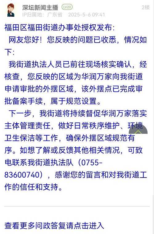 下一步,我街道將持續(xù)督促華潤萬家落實主體管理責(zé)任,做好日常秩序維護(hù)、環(huán)境衛(wèi)生保潔等工作,確保外擺區(qū)域規(guī)范有序。如想了解或反饋其他相關(guān)情況,可致電聯(lián)系我街道執(zhí)法隊(0755-83600740),感謝您的留言和對我街道工作的信任和支持。