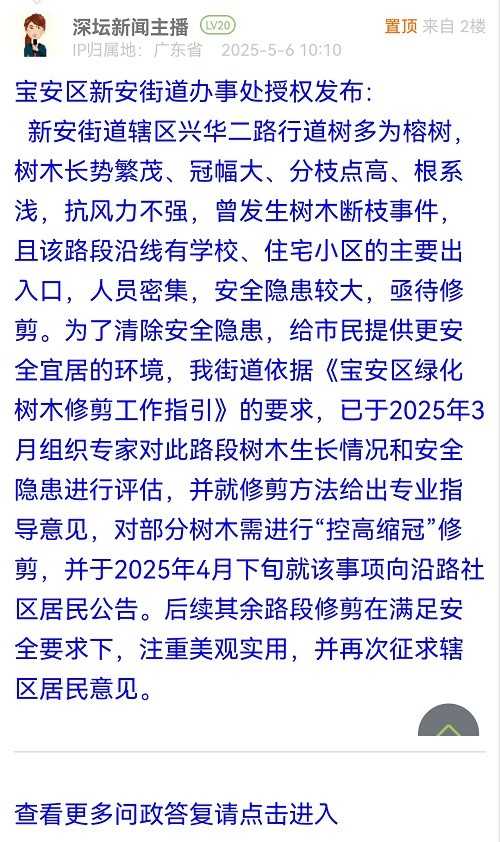 新安街道轄區(qū)興華二路行道樹多為榕樹,樹木長勢繁茂、冠幅大、分枝點高、根系淺,抗風(fēng)力不強(qiáng),曾發(fā)生樹木斷枝事件,且該路段沿線有學(xué)校、住宅小區(qū)的主要出入口,人員密集,安全隱患較大,亟待修剪。為了清除安全隱患,給市民提供更安全宜居的環(huán)境,我街道依據(jù)《寶安區(qū)綠化樹木修剪工作指引》的要求,已于2025年3月組織專家對此路段樹木生長情況和安全隱患進(jìn)行評估,并就修剪方法給出專業(yè)指導(dǎo)意見,對部分樹木需進(jìn)行“控高縮冠”修剪,并于2025年4月下旬就該事項向沿路社區(qū)居民公告。后續(xù)其余路段修剪在滿足安全要求下,注重美觀實用,并再次征求轄區(qū)居民意見。