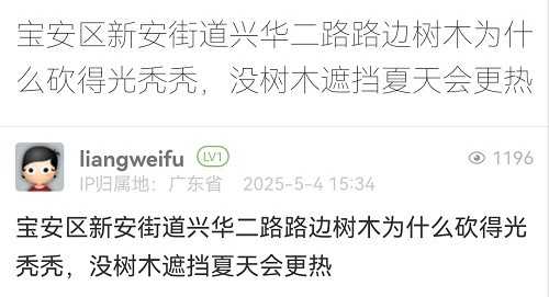 9. 帖文《寶安區(qū)新安街道興華二路路邊樹木為什么砍得光禿禿,沒樹木遮擋夏天會更熱》