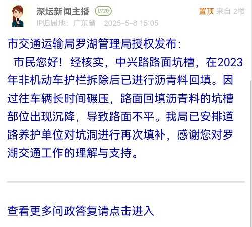 市民您好!經(jīng)核實,中興路路面坑槽,在2023年非機(jī)動車護(hù)欄拆除后已進(jìn)行瀝青料回填。因過往車輛長時間碾壓,路面回填瀝青料的坑槽部位出現(xiàn)沉降,導(dǎo)致路面不平。我局已安排道路養(yǎng)護(hù)單位對坑洞進(jìn)行再次填補(bǔ),感謝您對羅湖交通工作的理解與支持。
