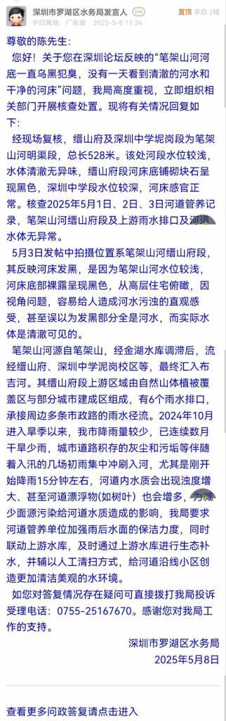 您好!關(guān)于您在深圳論壇反映的“筆架山河河底一直烏黑犯臭,沒有一天看到清澈的河水和干凈的河床”問題,我局高度重視,立即組織相關(guān)部門開展核查處置。現(xiàn)將有關(guān)情況回復(fù)如下: