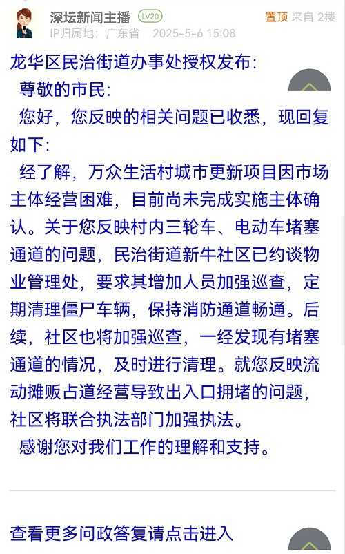 尊敬的市民:您好,您反映的相關(guān)問題已收悉,現(xiàn)回復(fù)如下:經(jīng)了解,萬眾生活村城市更新項目因市場主體經(jīng)營困難,目前尚未完成實施主體確認(rèn)。關(guān)于您反映村內(nèi)三輪車、電動車堵塞通道的問題,民治街道新牛社區(qū)已約談物業(yè)管理處,要求其增加人員加強(qiáng)巡查,定期清理僵尸車輛,保持消防通道暢通。后續(xù),社區(qū)也將加強(qiáng)巡查,一經(jīng)發(fā)現(xiàn)有堵塞通道的情況,及時進(jìn)行清理。就您反映流動攤販占道經(jīng)營導(dǎo)致出入口擁堵的問題,社區(qū)將聯(lián)合執(zhí)法部門加強(qiáng)執(zhí)法。感謝您對我們工作的理解和支持。