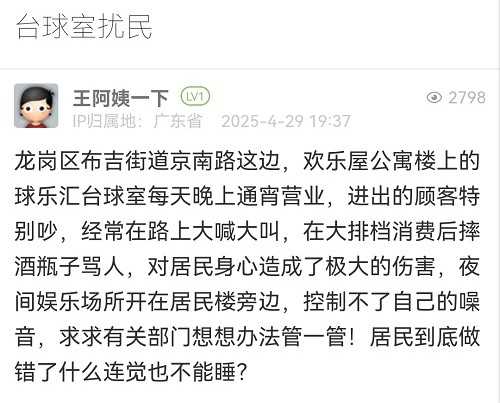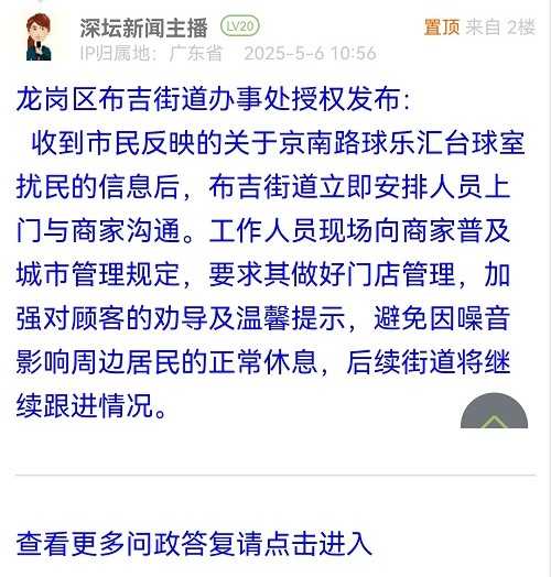 收到市民反映的關(guān)于京南路球樂匯臺球室擾民的信息后,布吉街道立即安排人員上門與商家溝通。工作人員現(xiàn)場向商家普及城市管理規(guī)定,要求其做好門店管理,加強(qiáng)對顧客的勸導(dǎo)及溫馨提示,避免因噪音影響周邊居民的正常休息,后續(xù)街道將繼續(xù)跟進(jìn)情況。
