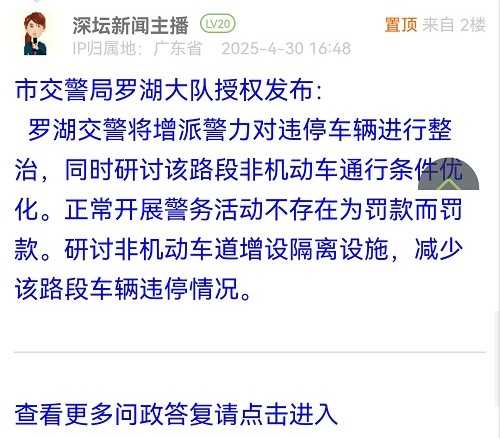 羅湖交警將增派警力對違停車輛進(jìn)行整治,同時研討該路段非機(jī)動車通行條件優(yōu)化。正常開展警務(wù)活動不存在為罰款而罰款。研討非機(jī)動車道增設(shè)隔離設(shè)施,減少該路段車輛違停情況。