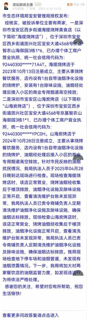 經(jīng)核實,被投訴單位主要有兩家,一是深圳市寶安區(qū)西鄉(xiāng)街道海提燒烤美食店(以下簡稱“海提燒烤店”),位于深圳市寶安區(qū)西鄉(xiāng)街道固興社區(qū)寶安大道4568號京基智農(nóng)山海御園3棟1*6,已辦理個體工商戶營業(yè)執(zhí)照,統(tǒng)一社會信用代碼為:92440300*****71A4T。海提燒烤店于2023年10月13日注冊成立,主要從事燒烤餐飲服務(wù),店內(nèi)設(shè)有1臺自帶油煙凈化設(shè)施的燒烤爐,安裝有1臺除味設(shè)施,油煙經(jīng)處理后接入小區(qū)的商業(yè)專用煙道高空排放;二是深圳市寶安區(qū)山海炭烤店(以下簡稱“山海炭烤店”),位于深圳市寶安區(qū)西鄉(xiāng)街道固興社區(qū)寶安大道4568號京基智農(nóng)山海御園3棟1*1,已辦理個體工商戶營業(yè)執(zhí)照,統(tǒng)一社會信用代碼為:92440300*****YPC0H。山海炭烤店于2024年10月28日注冊成立,主要從事燒烤餐飲服務(wù),店內(nèi)設(shè)有1臺自帶油煙凈化設(shè)施的燒烤爐,油煙經(jīng)處理后接入小區(qū)的商業(yè)專用煙道高空排放。針對市民反映的油煙擾民情況,我局執(zhí)法人員于2025年04月28日晚到達(dá)現(xiàn)場進(jìn)行檢查。現(xiàn)場檢查海提燒烤店時,該店正常營業(yè),燒烤油煙經(jīng)收集后于樓頂排放,油煙凈化設(shè)施及除味設(shè)施正常開啟,查看清洗維護(hù)臺賬未發(fā)現(xiàn)異常,我局執(zhí)法人員已責(zé)令商鋪負(fù)責(zé)人定期清洗維護(hù)油煙凈化設(shè)施及除味設(shè)施,確保油煙達(dá)標(biāo)排放?,F(xiàn)場檢查山海炭烤店時,該店正常營業(yè),燒烤油煙經(jīng)收集后于樓頂排放,油煙凈化設(shè)施正常開啟,查看清洗維護(hù)臺賬未發(fā)現(xiàn)異常,我局執(zhí)法人員已責(zé)令商鋪負(fù)責(zé)人定期清洗維護(hù)油煙凈化設(shè)施及除味設(shè)施,確保油煙達(dá)標(biāo)排放。我局現(xiàn)場檢查地下停車場和油煙管道,未發(fā)現(xiàn)有油煙泄露情況。下一步,我局將加大對兩家餐飲店的油煙監(jiān)管力度,如發(fā)現(xiàn)違法行為將依法嚴(yán)格處理。感謝您的關(guān)注,希望對您有所幫助,祝您生活愉快!