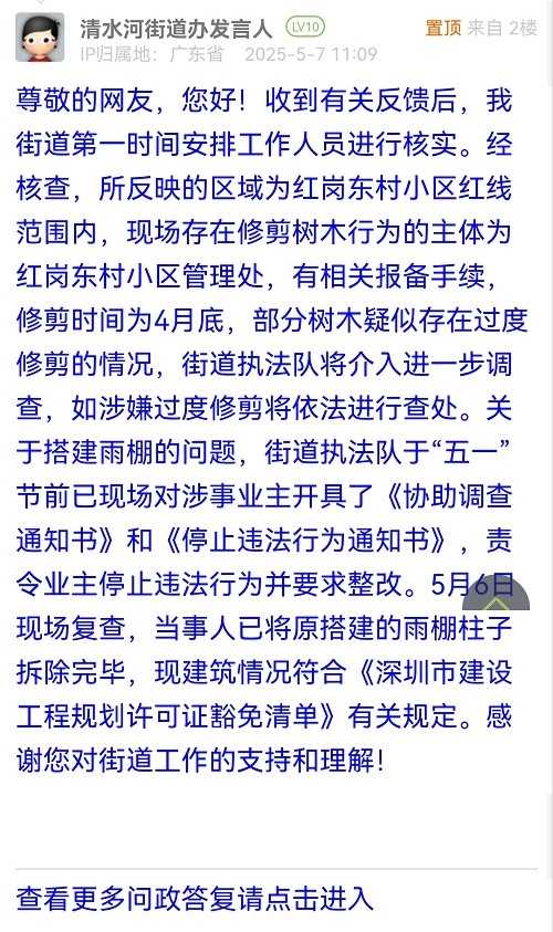 尊敬的網(wǎng)友,您好!收到有關(guān)反饋后,我街道第一時間安排工作人員進(jìn)行核實。經(jīng)核查,所反映的區(qū)域為紅崗東村小區(qū)紅線范圍內(nèi),現(xiàn)場存在修剪樹木行為的主體為紅崗東村小區(qū)管理處,有相關(guān)報備手續(xù),修剪時間為4月底,部分樹木疑似存在過度修剪的情況,街道執(zhí)法隊將介入進(jìn)一步調(diào)查,如涉嫌過度修剪將依法進(jìn)行查處。關(guān)于搭建雨棚的問題,街道執(zhí)法隊于“五一”節(jié)前已現(xiàn)場對涉事業(yè)主開具了《協(xié)助調(diào)查通知書》和《停止違法行為通知書》,責(zé)令業(yè)主停止違法行為并要求整改。5月6日現(xiàn)場復(fù)查,當(dāng)事人已將原搭建的雨棚柱子拆除完畢,現(xiàn)建筑情況符合《深圳市建設(shè)工程規(guī)劃許可證豁免清單》有關(guān)規(guī)定。感謝您對街道工作的支持和理解!