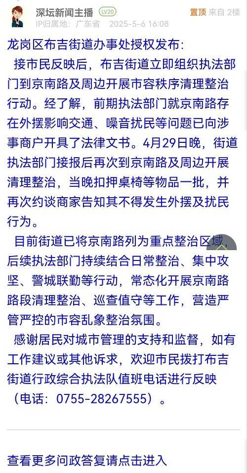 接市民反映后,布吉街道立即組織執(zhí)法部門到京南路及周邊開展市容秩序清理整治行動。經(jīng)了解,前期執(zhí)法部門就京南路存在外擺影響交通、噪音擾民等問題已向涉事商戶開具了法律文書。4月29日晚,街道執(zhí)法部門接報后再次到京南路及周邊開展清理整治,當(dāng)晚扣押桌椅等物品一批,并再次約談商家告知其不得發(fā)生外擺及擾民行為。