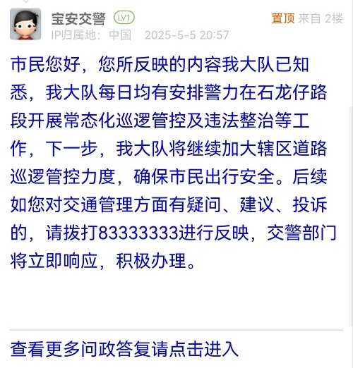 市民您好,您所反映的內(nèi)容我大隊已知悉,我大隊每日均有安排警力在石龍仔路段開展常態(tài)化巡邏管控及違法整治等工作,下一步,我大隊將繼續(xù)加大轄區(qū)道路巡邏管控力度,確保市民出行安全。后續(xù)如您對交通管理方面有疑問、建議、投訴的,請撥打83333333進(jìn)行反映,交警部門將立即響應(yīng),積極辦理。